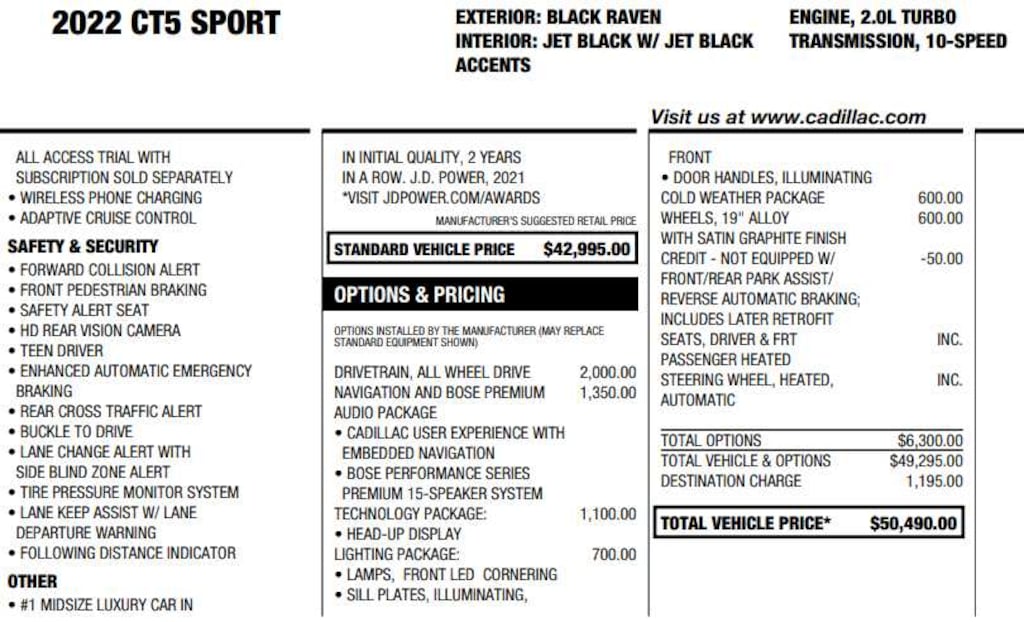 DRIVETRAIN, ALL-WHEEL DRIVE, NAVIGATION AND BOSE PREMIUM AUDIO PACKAGE includes (IOT) Cadillac user experience with embedded navigation and (UQP) Bose Performance Series 15-speaker premium audio system, TECHNOLOGY PACKAGE includes (UDV) 12" diagonal HD color reconfigurable driver cluster and (UV6) Head-Up Display, WHEELS, 19" (48.3 CM) ALLOY WITH SATIN GRAPHITE FINISH (Includes (QBJ) 245/40R19 all-season, run-flat tires.), COLD WEATHER PACKAGE includes (KA1) heated driver and front passenger seats and (KI3) heated steering wheel Vehicles built prior to December 6, 2021 and after March 27, 2022, include heated steering wheel. Certain vehicles built on or after December 6, 2021 through March 27, 2022, will be forced to include (00G) Not Equipped with Heated Steering Wheel, which removes heated steering wheel. See dealer for details or the window label for the features on a specific vehicle. Vehicles built prior to March 14, 2022 and after May 1, 2022, include driver and front passenger heated seats. Certain vehicles built on or after March 14, 2022 through May 1, 2022, will be forced to include (00V) Not Equipped with Driver and Front Passenger Heated or Ventilated Seats, which removes driver and front, CADILLAC USER EXPERIENCE WITH EMBEDDED NAVIGATION AM/FM stereo with connected navigation providing real-time traffic, 10" diagonal HD color information display, 3 USBs, personalized profiles for each driver's settings, Natural Voice Recognition, Phone Integration for Wireless Apple CarPlay®/Wireless Android Auto® capability for compatible phone, Connected Apps and Teen Driver, ENGINE, 2.0L TWIN-SCROLL TURBO, 4-CYLINDER, SIDI with Automatic Stop/Start (235 hp [177 kW] @ 5000 rpm, 258 lb-ft of torque [350 N-m] @ 1500-4000 rpm) [Cadillac Estimated] (STD), TRANSMISSION, 10-SPEED AUTOMATIC (STD).
