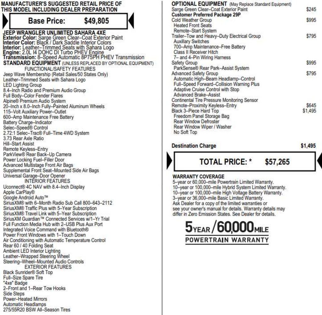 BLACK 3-PIECE HARD TOP Freedom Panel Storage Bag, Rear Window Defroster, Rear Window Wiper/Washer, No Soft Top, COLD WEATHER GROUP Heated Steering Wheel, Remote Start System, Heated Front Seats, SAFETY GROUP Blind Spot & Cross Path Detection, ParkSense Rear Park Assist System, TRAILER TOW & HD ELECTRICAL GROUP Class II Receiver Hitch, 700 Amp Maintenance Free Battery, 7 & 4 Pin Wiring Harness, Auxiliary Switches, ADVANCED SAFETY GROUP Adaptive Cruise Control w/Stop, Advanced Brake Assist, Auto High Beam Headlamp Control, Full Speed Forward Collision Warning Plus, REMOTE PROXIMITY KEYLESS ENTRY, TRANSMISSION: 8-SPEED AUTO 8P75PH PHEV (STD), ENGINE: 2.0L I4 DOHC DI TURBO PHEV (STD).
